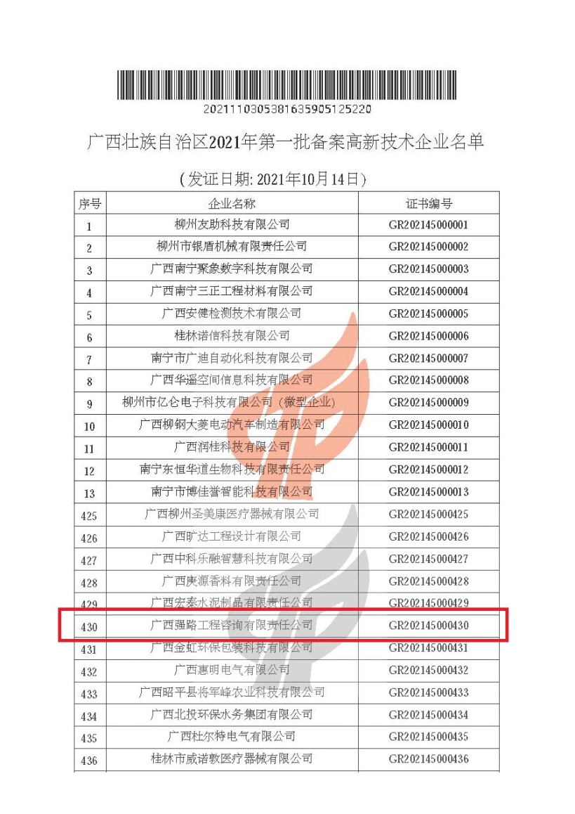 近日,高新技術企業認定管理工作網公布了廣西壯族自治區2021年第一批備案的538家高新技術企業名單,北投公路集團直屬企業廣西強路工程咨詢有限責任公司名列其中。