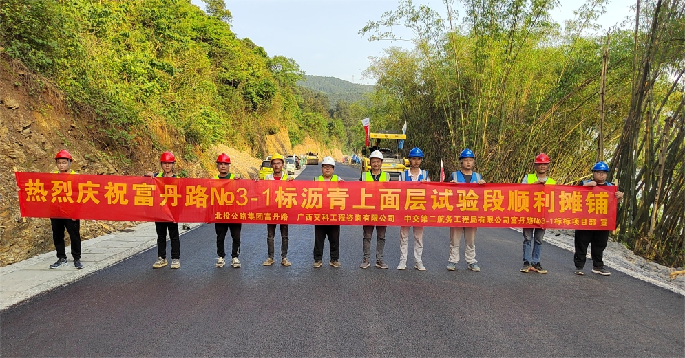 5月1日國際勞動節當天,伴隨著攤鋪機、壓路機的轟鳴,富丹路(二期)K73+800~K74+300段瀝青上面層試驗段順利鋪筑,標志著北投公路集團富丹路(二期)向年度通車目標邁出關鍵性一步。