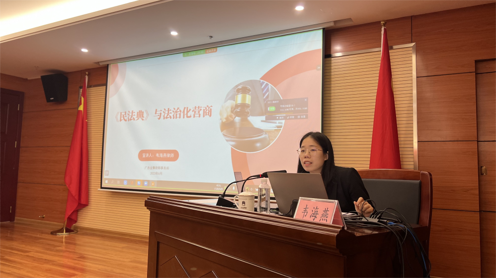 韋海燕律師以《<民法典>與法治化營商》為主題,向集團公司干部職工講解民法典相關法律規定。韋海燕律師首先系統介紹了《民法典》的編纂歷程,后通過介紹、講解《民法典》的主要內容,深入宣傳民法典關于民事活動平等、自愿、公平、誠信、守法和公序良俗、綠色等基本原則,闡釋民法典關于堅持主體平等、保護財產權利、便利交易流轉、維護人格尊嚴、促進家庭和諧、追究侵權責任等內容,系統闡釋民法典總則編、物權編、合同編、人格權編、婚姻家庭編、繼承編、侵權責任編等方面的重要內容,同時結合企業經營、營商環境,闡述企業如何法治化營商,并結合集團公司開展營商活動的實際問題闡釋相關法律風險。
