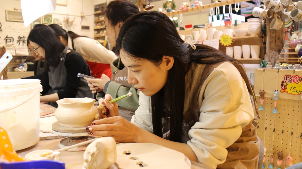 經過三個半小時的精心創作,小花、碗、招財進寶、水杯、筆筒等小作品紛紛完成,經過描繪圖案和上色之后,原本樸素的陶藝作品頓時變得活靈活現,大家都期待早日拿到經過上釉和燒制后的作品。